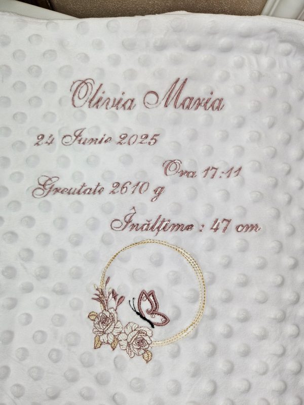 Pentru a transforma aceasta paturica intr-un cadou unic, va oferim optiunea de personalizare prin broderie cu numele copilului, un mesaj sau o imagine preferata.