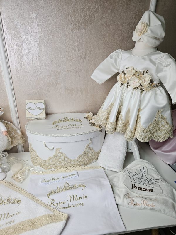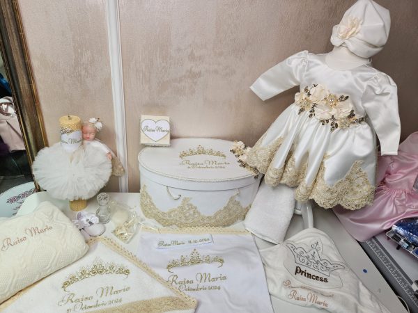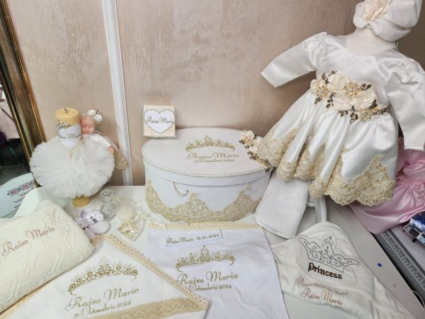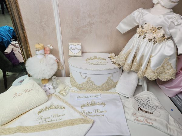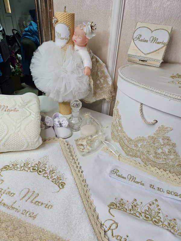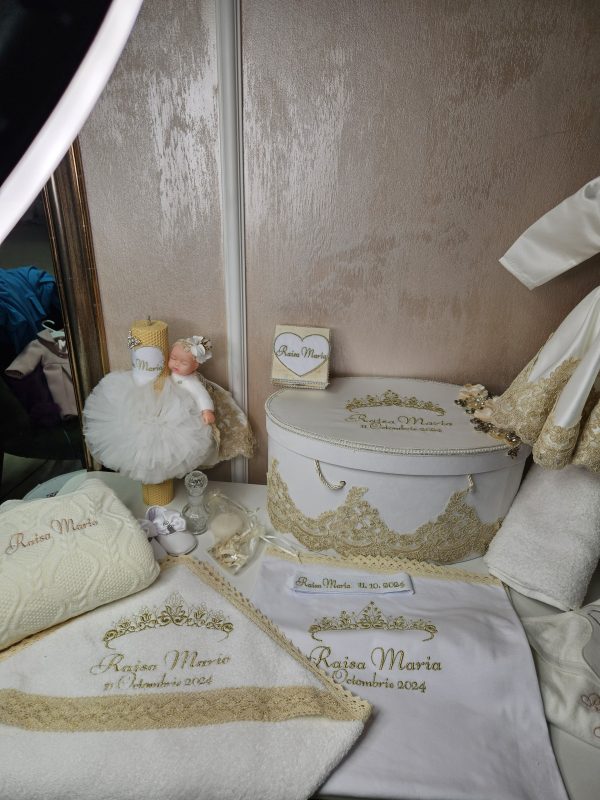 Setul poate include: Prosop pentru bebeluș, pânză de mir, body sau costumaș, fâșă, prosop pentru preot, săpun, batistuță și sticluță pentru mir, toate asortate cu dantelă aurie.