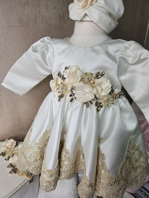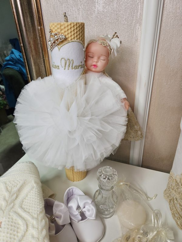 Un trusou alb cu dantelă aurie și o lumânare din ceară naturală este o alegere elegantă și rafinată pentru botez sau alte evenimente speciale.