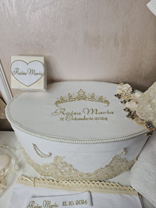 Decor: Împodobită cu dantelă aurie, funde din satin și elemente delicate, precum perle sau flori textile, pentru un plus de eleganță.