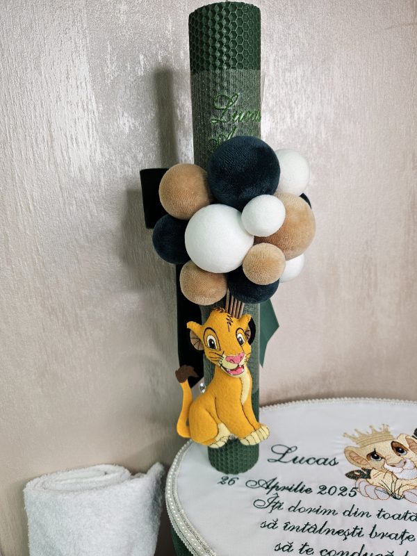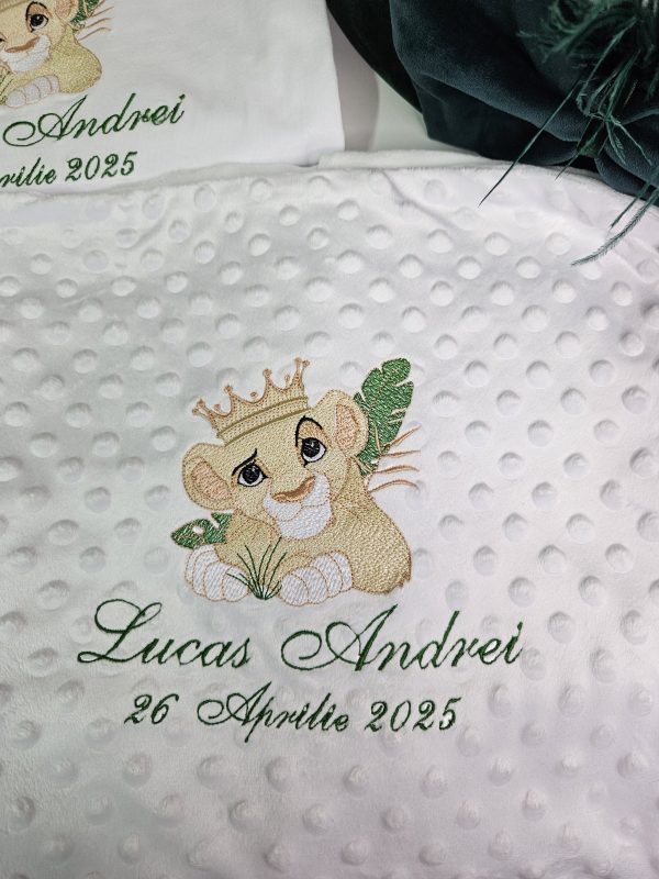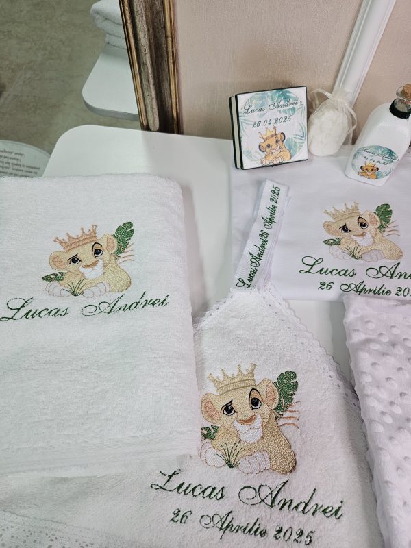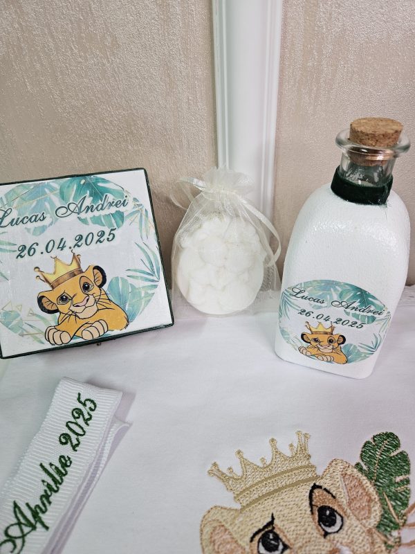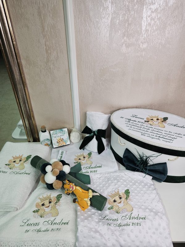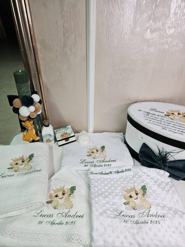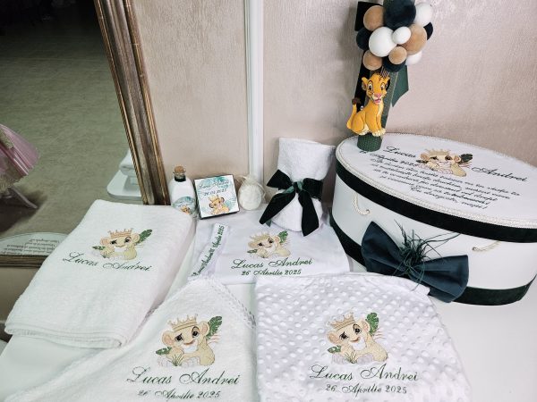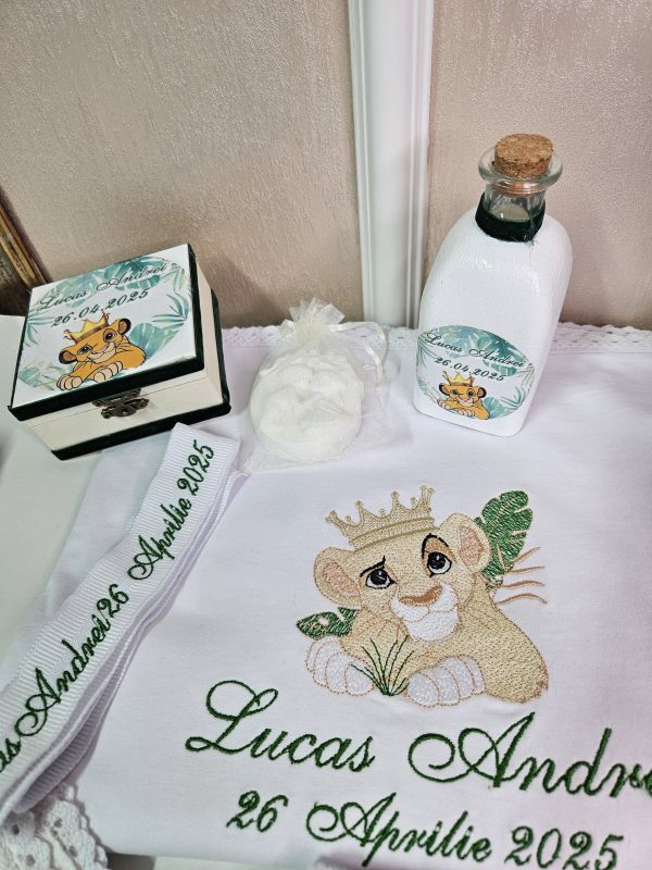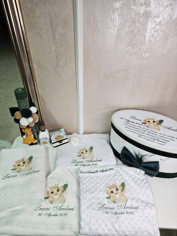 Inspirat din îndrăgitul personaj Simba din "Regele Leu", acest trusou aduce un strop de magie și bucurie în cea mai specială zi a micuțului tău. Realizat cu atenție la detalii, fiecare piesă combină delicatețea materialelor de calitate superioară cu designul adorabil inspirat din savana africană.Conținutul trusoului include: Prosop mare cu capișon brodat cu Simba,Pânză de mir fină, decorată tematic,Fășă de botez asortată,Sticluță pentru mir, decorată cu elemente safari,Săpunel decorativ,Cutiuță pentru prima șuviță sau prima cruciuliță,prosopel pentru preot,Cutie elegantă pentru trusou, cu imprimeu Simba și numele bebelușului (opțional personalizat).Caracteristici:-Materiale moi și hipoalergenice, perfecte pentru pielea sensibilă a bebelușului,Broderii și imprimeuri de înaltă calitate, rezistente la spălări repetate.